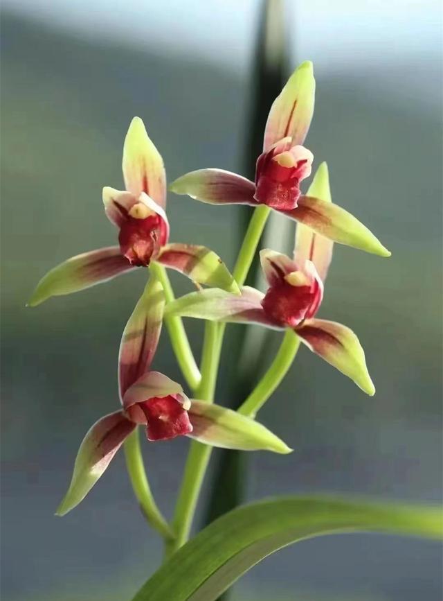 国魂的美丽,首先体现在它那错综复杂、层次分明的色彩上。花瓣的外缘呈现出一抹翠绿色或温暖的黄色,犹如春天里刚刚吐露的嫩叶,在阳光下闪耀着柔和的光辉。而中间的花舌则是一片鲜艳的红色,如同烈火般炽热。复杂的花色配上翠绿有光泽的叶片显得是那么相得益彰。我相信,即便是再过几百年,兰花界还会有它的一席之地。